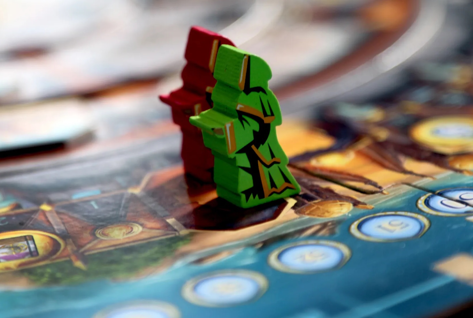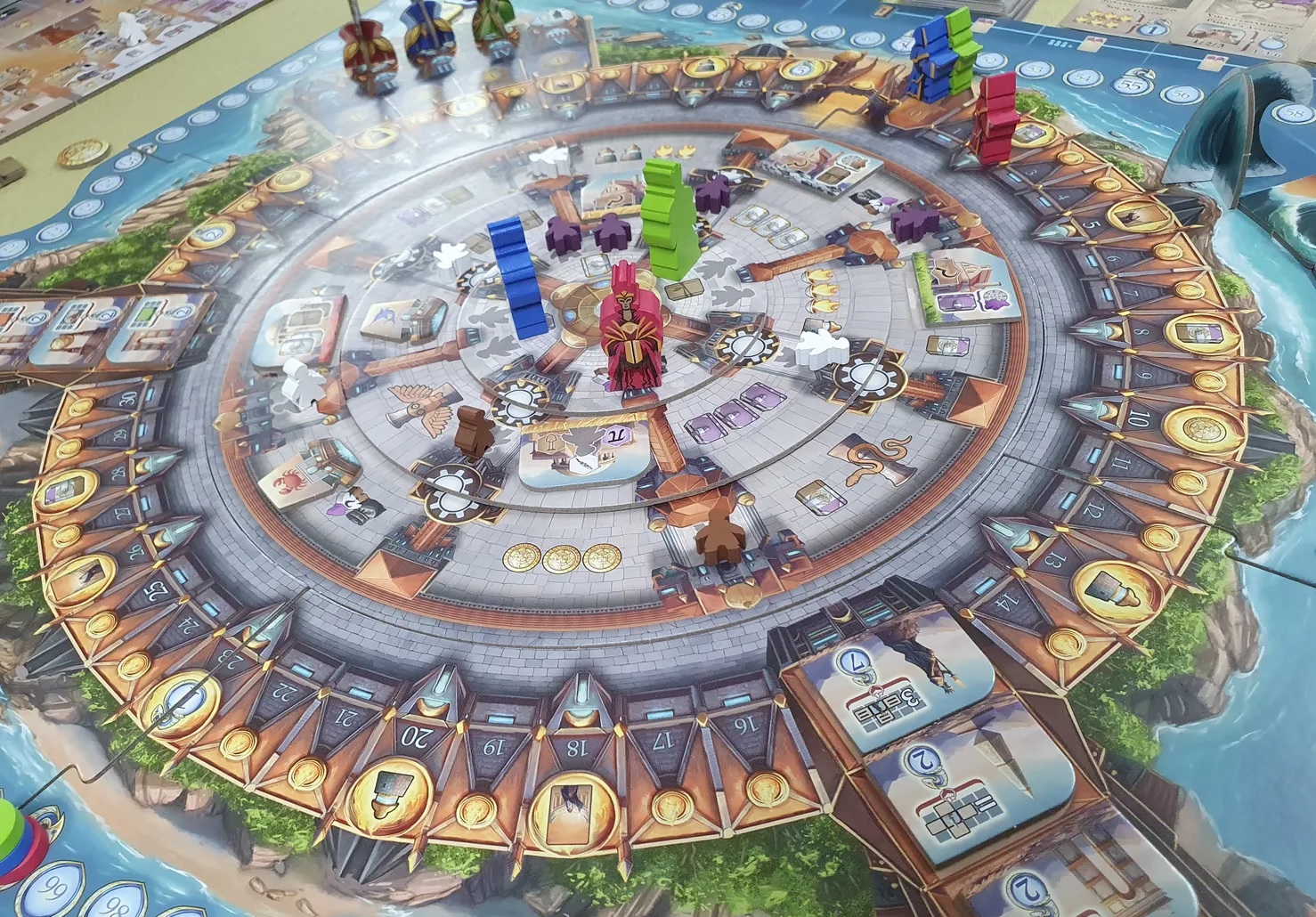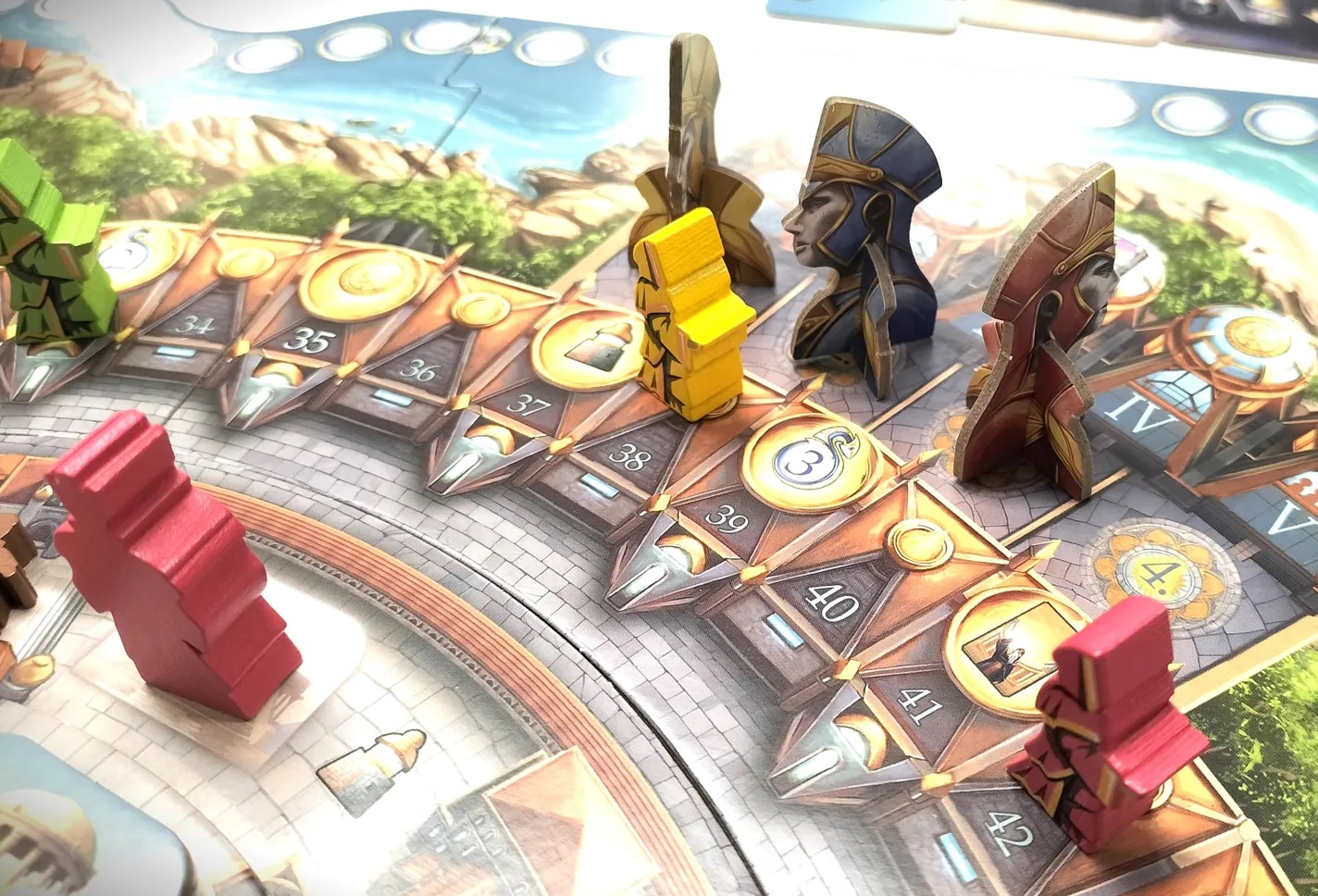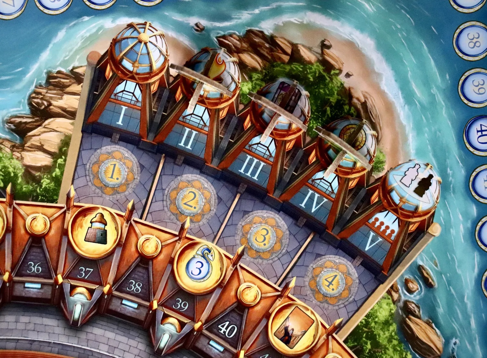 Durante cada uno de los 5 años, nuestro rey se moverá por cada uno de los tres niveles de la ciudad, activando bonificaciones y beneficios. Como al final del año el tablero circular rota aleatoriamente, la combinación de efectos cambiará cada año, haciendo que no podamos repetir la misma ruta dos veces.
