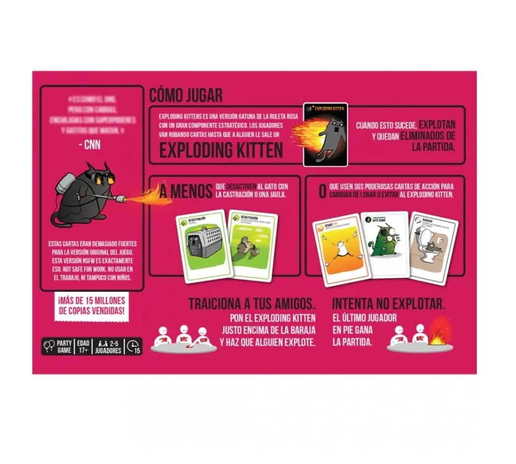 El Juego Exploding Kittens nunca fue tan irreverente y tan grotesco, el juego es tal cual su versión más «friendly» pero las ilustraciones y los textos no son aptos para niños.