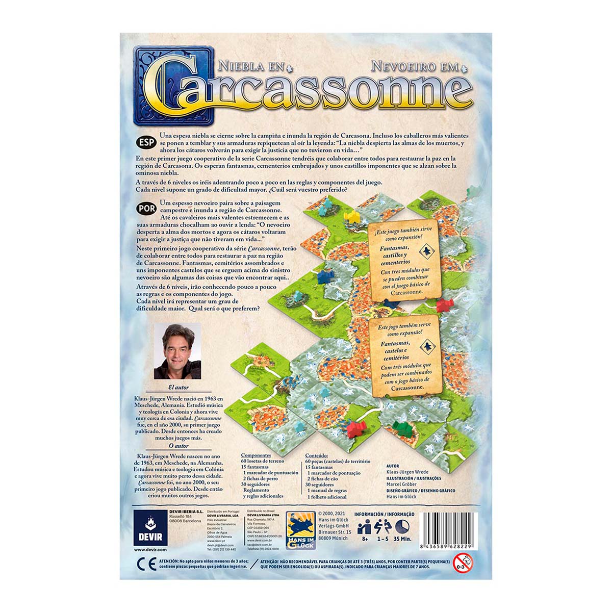 Niebla en Carcassonne es una versión cooperativa del conocido juego de colocación de losetas Carcassonne. Trabajando juntos, colocas losetas y consigues puntos mientras intentas detener la propagación de fantasmas, contener el suelo embrujado en los cementerios y utilizar los castillos embrujados en tu beneficio. Si hay demasiados fantasmas sueltos por el suelo o has conseguido muy pocos puntos cuando se acaban las fichas, pierdes la partida. Si consigues sobrevivir tres días, puedes ajustar el nivel de dificultad del juego para aumentar el desafío.