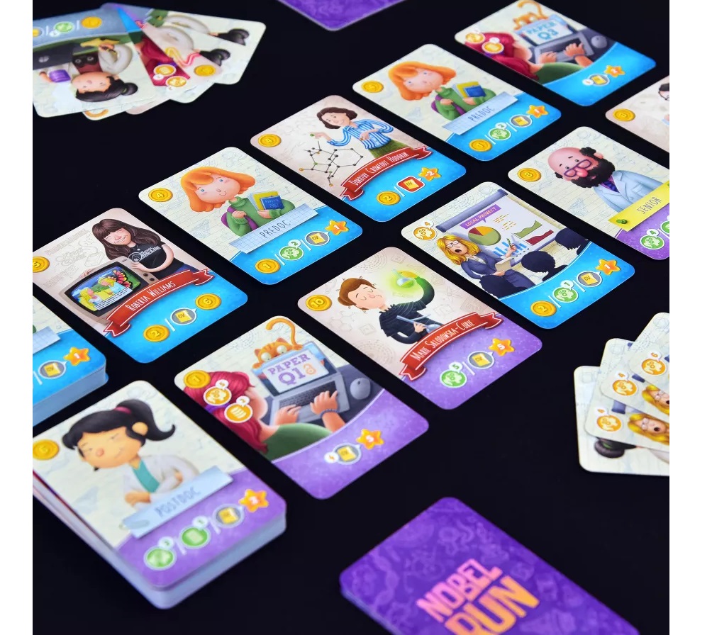 Nobel Run es un juego de construcción de mazos en el que gestionarás un equipo de investigación, contratarás predoctorados, posdoctorados y seniors, publicarás artículos y conseguirás financiación a través de proyectos internacionales. Científicos e inventores de primer nivel te ayudarán en tu misión. ¿Ganarás el Premio Nobel?
