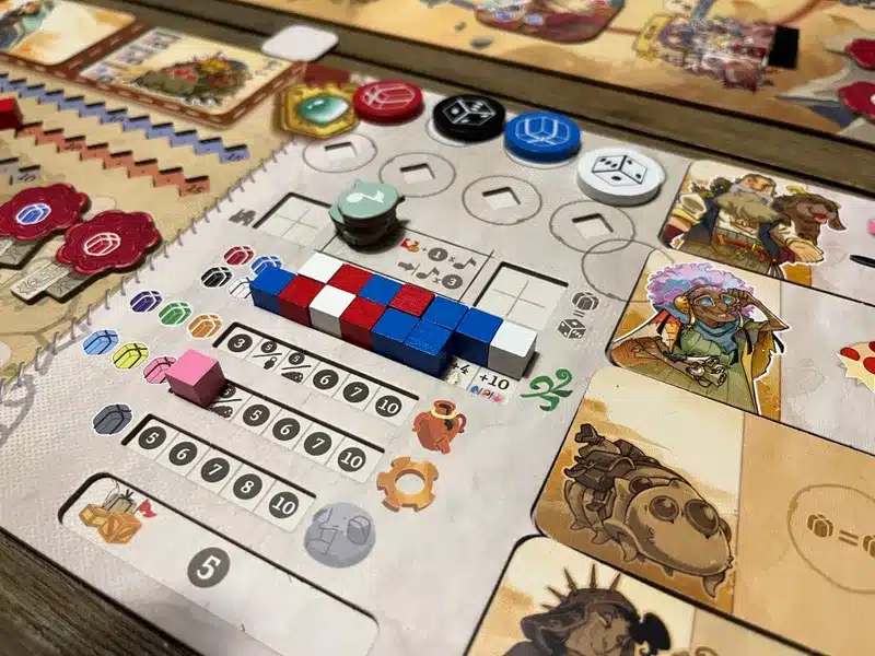 Pero no solo de oro se nutren los habitantes del desierto. En Sand también se pueden realizar oraciones para modificar resultados de un dado, ganar prestigio (cosa que nos dará oro adicional al hacer las entregas) o componer canciones en ciudades, cosa que nos bonificará cuando entreguemos mercancías allí.