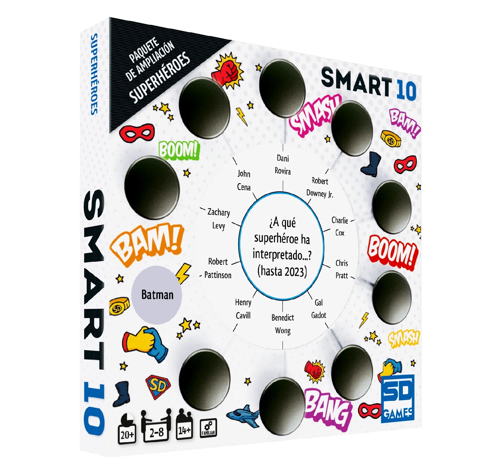 Puedes reemplazar las tarjetas de preguntas en la caja Smart con dos paquetes de ampliación temáticos o mezclar estas preguntas de superhéroes con la mitad de las tarjetas originales. Para poder usar estas preguntas, se requiere tener la caja Smart incluida en cualquier juego base de Smart 10.