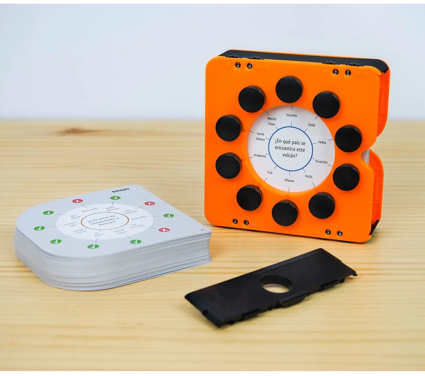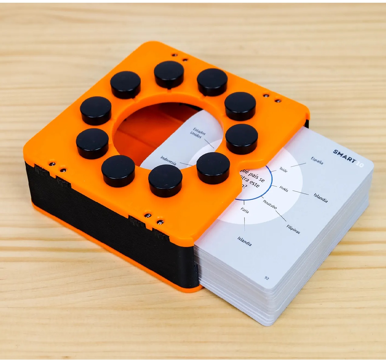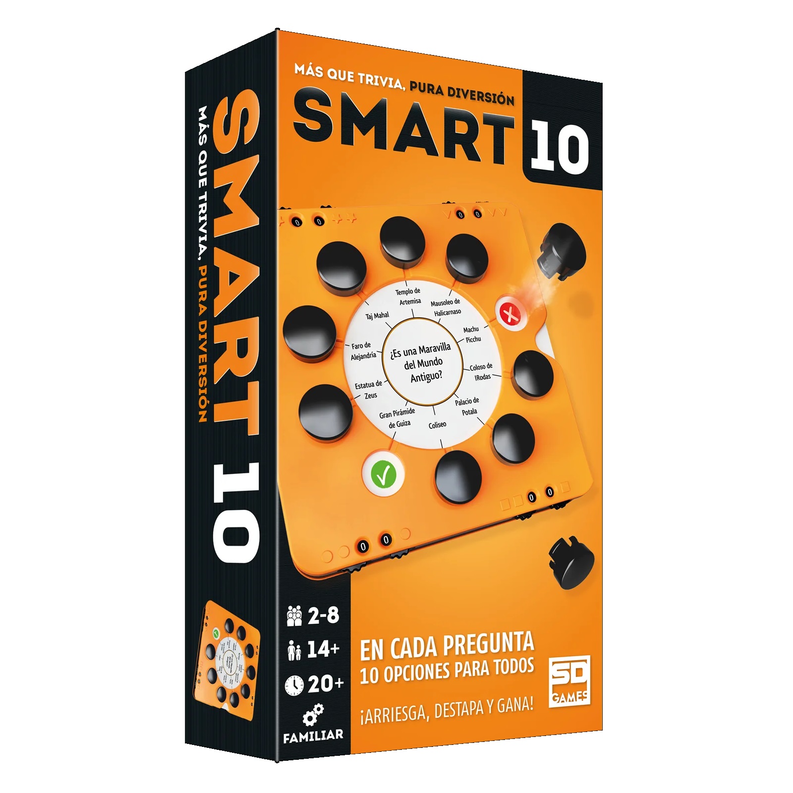 Smart 10 es un juego de trivia con una mecánica súper práctica: en el centro hay un “disco” con una pregunta y 10 respuestas ocultas. En tu turno eliges si respondes levantando una tapa (si aciertas, te quedas con el punto; si fallas, pierdes los puntos de esa ronda) o si te plantas y aseguras lo que llevas. Esa decisión de arriesgar o asegurar es el corazón del juego: siempre estás pensando “¿me la juego por uno más o me retiro a tiempo?”