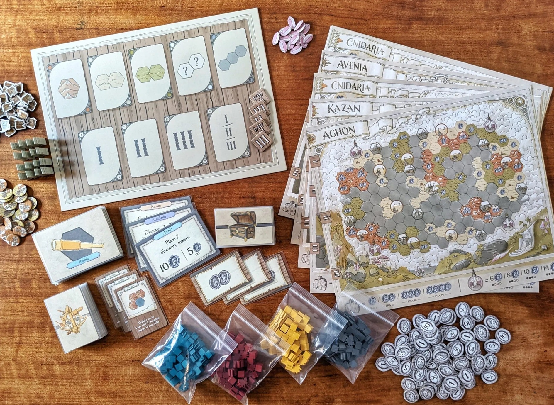 - 9 cartas de exploración, 5 básicas, 4 cartas de era